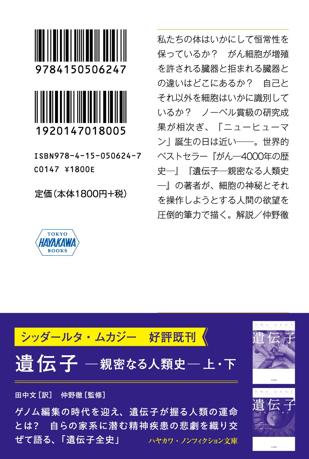 私たちの体はいかにして恒常性を保っているか? がん細胞が増殖を許される臓器と拒まれる臓器との違いはどこにあるか? 自己とそれ以外を細胞はいかに識別しているか? ノーベル賞級の研究成果が相次ぎ、「ニューヒューマン」誕生の日は近い――。世界的ベストセラー『がん―4000年の歴史―』『遺伝子―親密なる人類史―』の著者が、細胞の神秘とそれを操作しようとする人間の欲望を圧倒的筆力で描く。解説/仲野徹