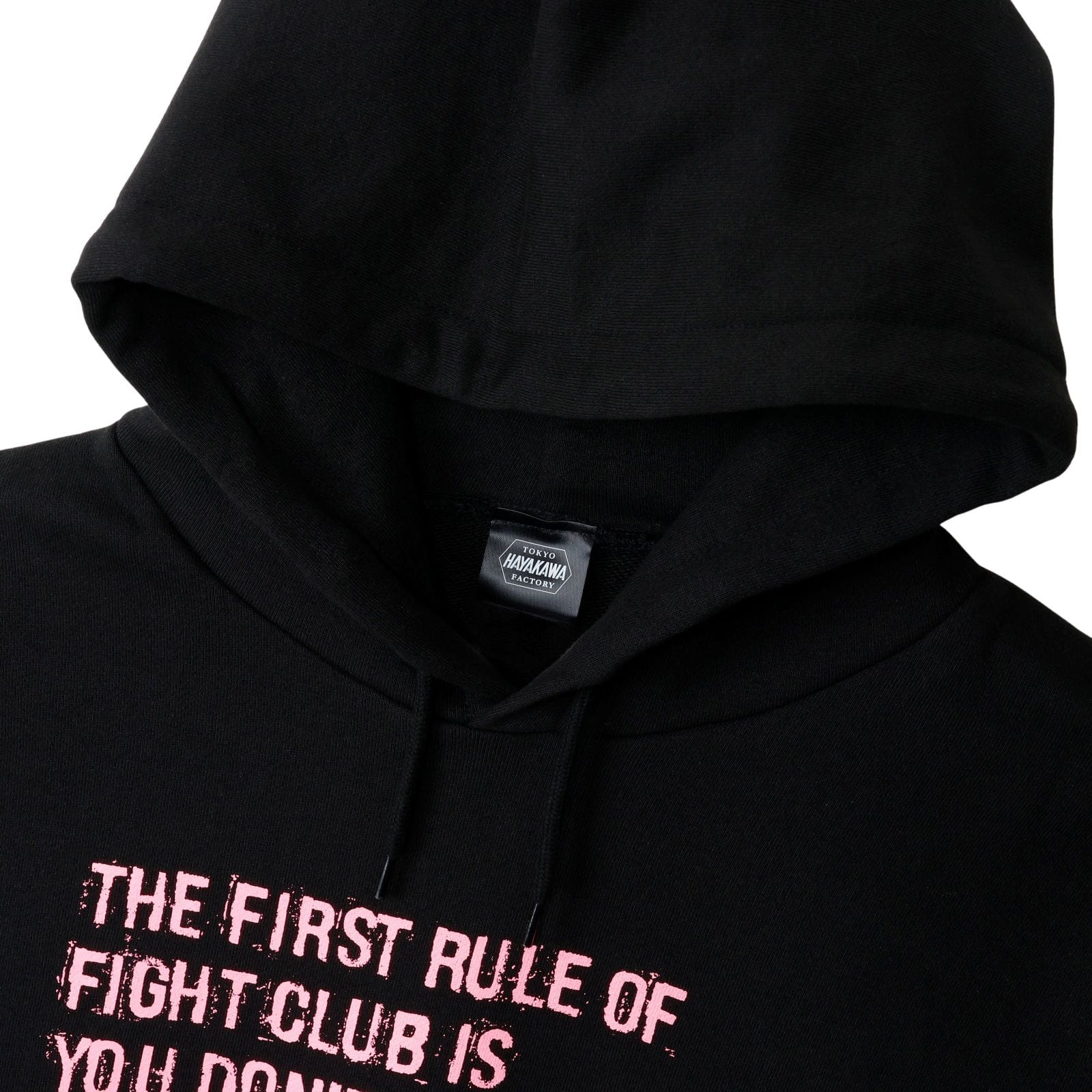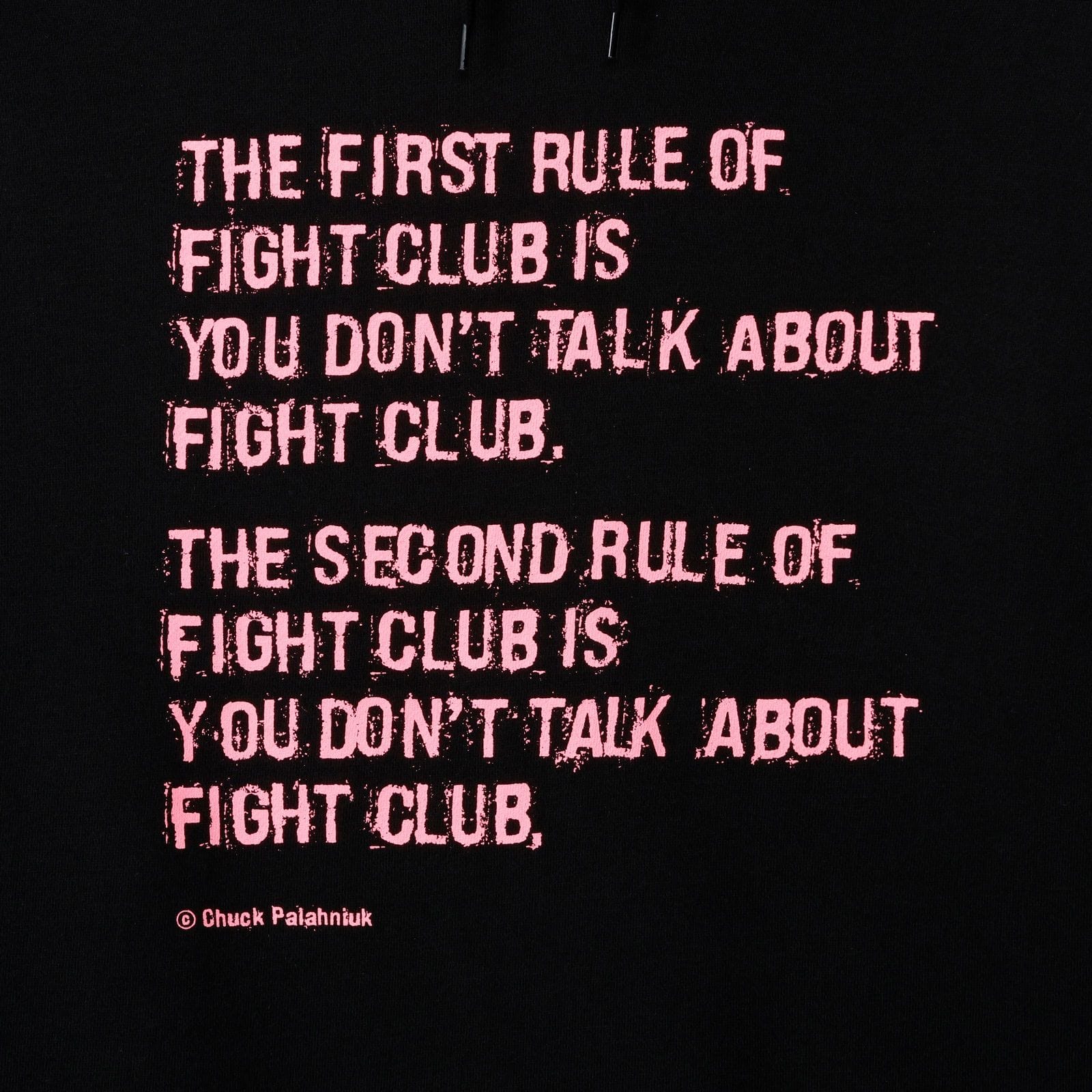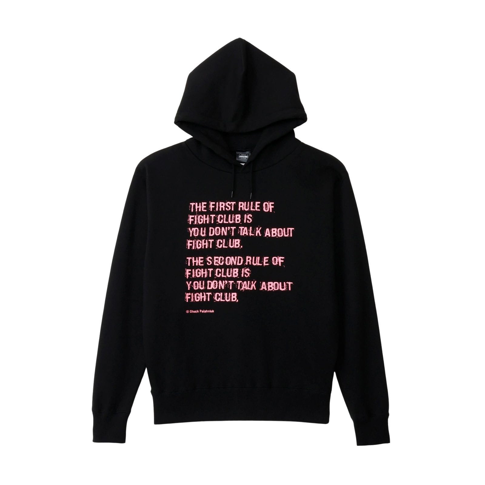黒をベースにしたシンプルなパーカーに、ピンクの文字で刻まれた第一・第二ルール。派手すぎないのに、しっかりと存在感を放つデザインです。映画や原作を知っている人なら、思わず目を留めるはず。