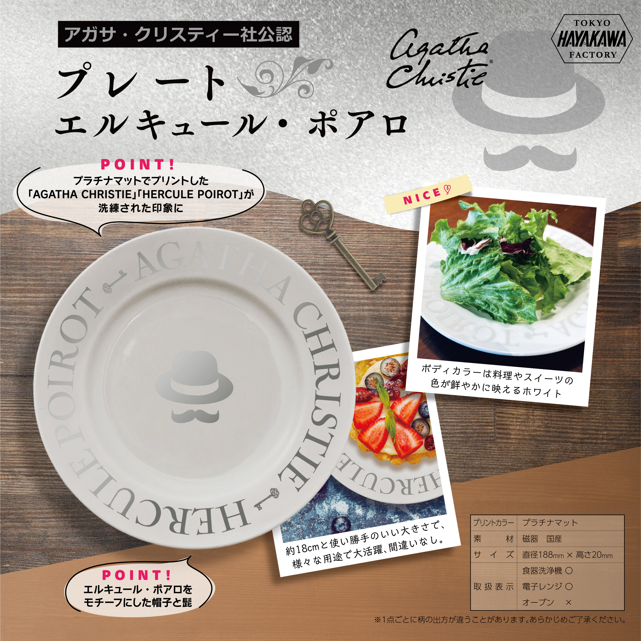 アガサ・クリスティー社公認の「エルキュール・ポアロ」プレートは、ミステリ好きにはたまらない逸品。リムには「AGATHA CHRISTIE」「HERCULE POIROT」の文字が上品にあしらわれ、中央にはポアロを象徴する帽子と髭がプラチナマットで描かれています。