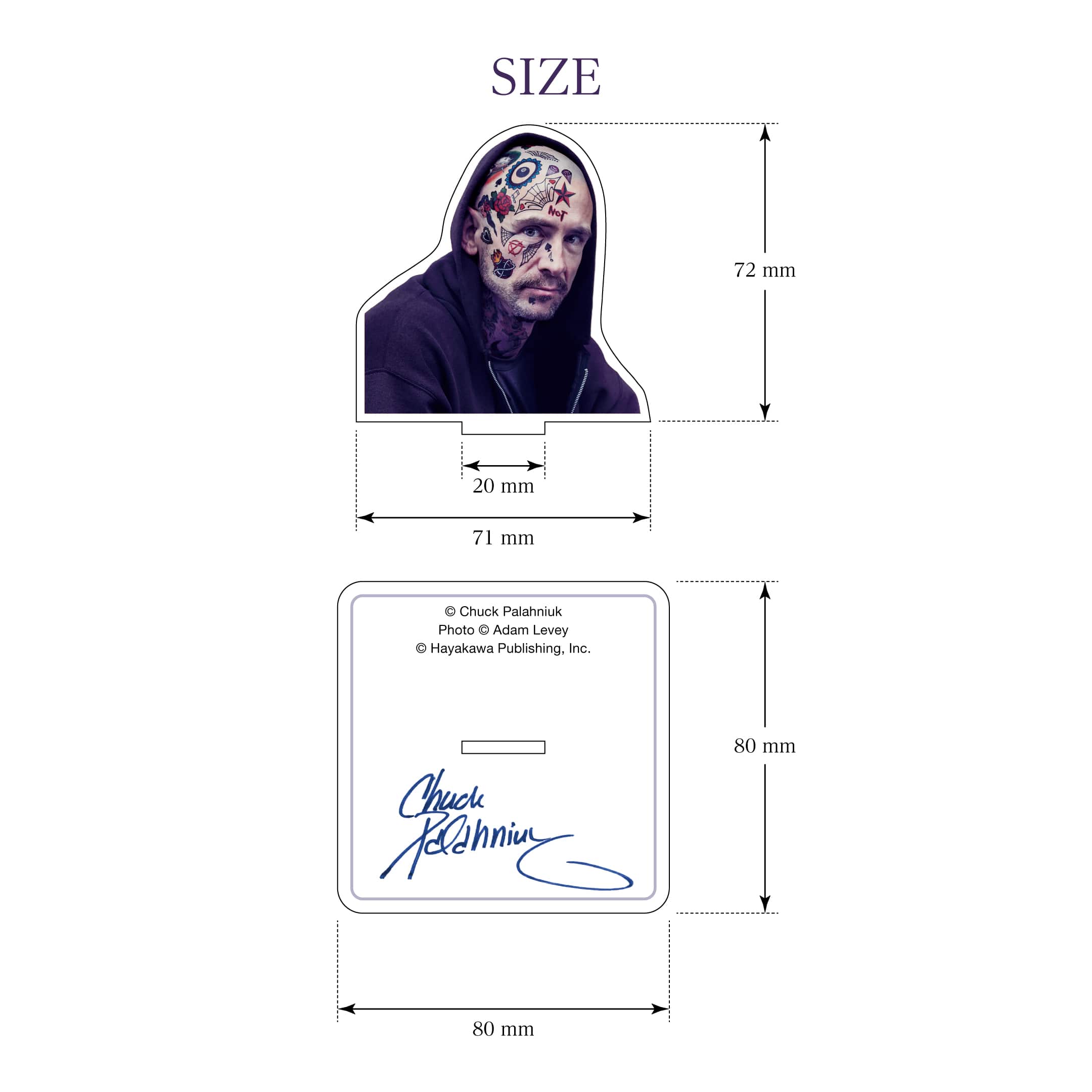 本体には、写真家 Adam Leveyによるチャック・パラニュークのポートレートを採用。輪郭に沿ったダイカット仕様により、立体感と存在感が際立ちます。台座部分には、チャック・パラニュークのサインをプリント。シンプルな構成のなかに、コレクションアイテムとしての特別感をしっかりと備えています。
